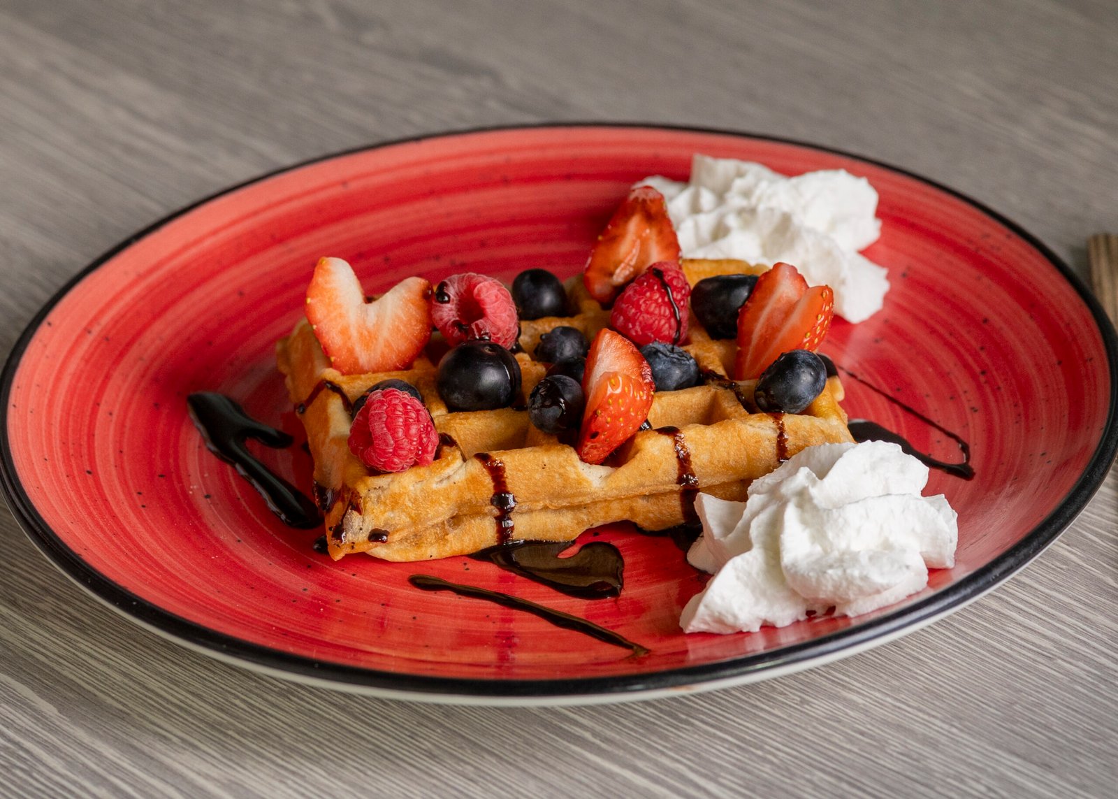 Gofre crujiente y esponjoso, servido con sirope de chocolate, nata y frutas frescas. Dulce y delicioso.