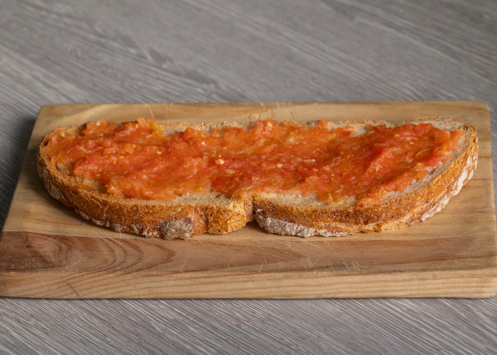 Pan de hogaza con tomate natural y un toque de aceite de oliva. Fresca y auténtica.